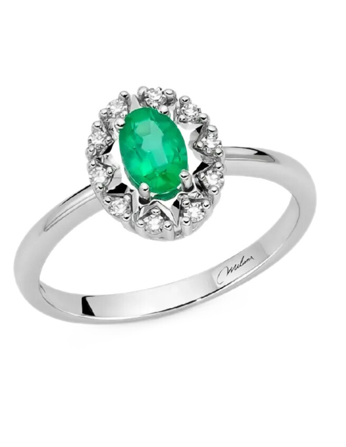 MilunaAnello Miluna in oro bianco 18Kt con smeraldo naturale ovale 6x4 mm e 10 diamanti naturali per un totale di 9,9 punti. Raffinato ed elegante.