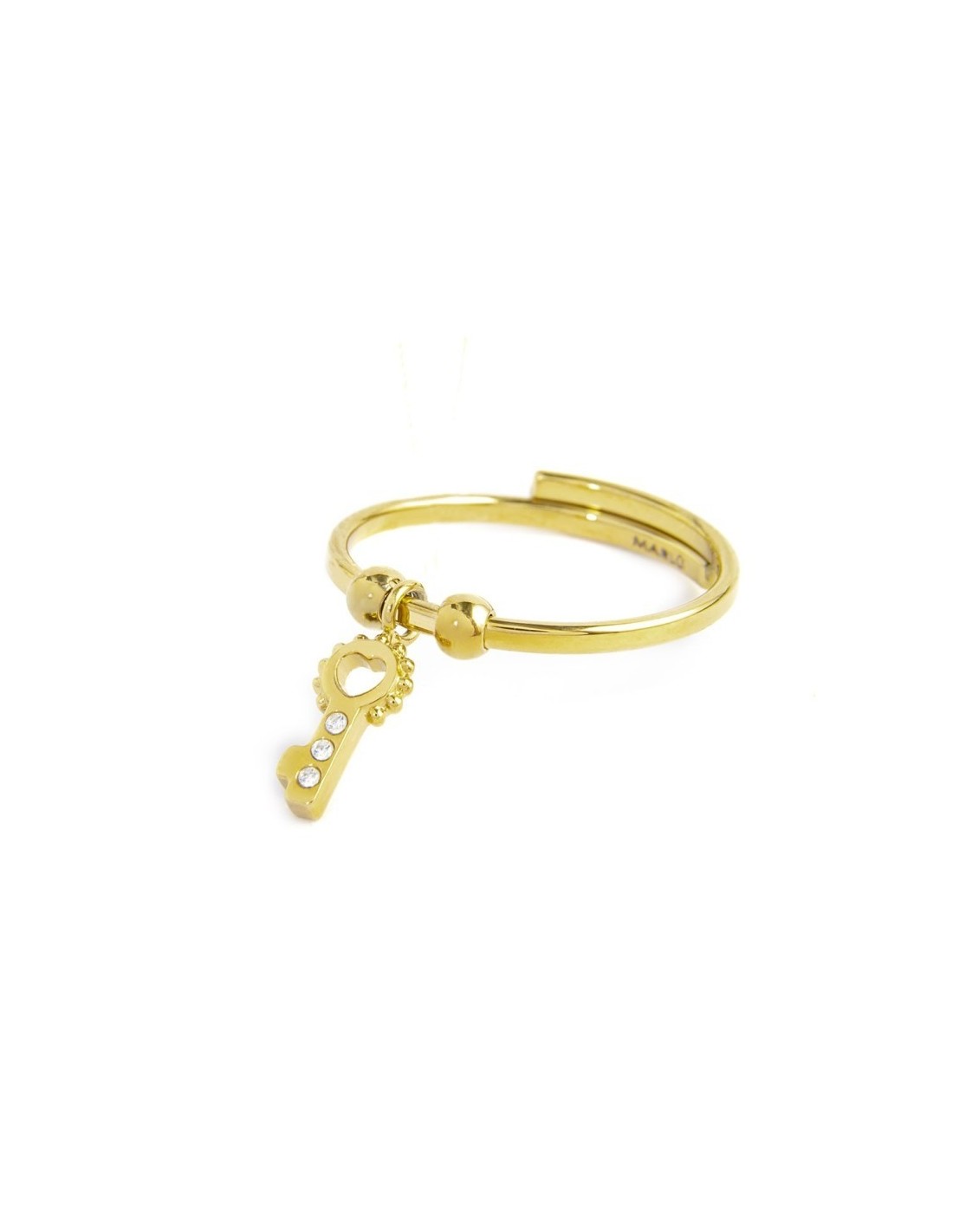 Delicato e simbolico, questo anello Marlù con chiave pendente è realizzato in acciaio PVD oro e impreziosito da cristalli bianchi. Regolabile e raffinato, rappresenta un messaggio di scoperta e nuovi inizi.