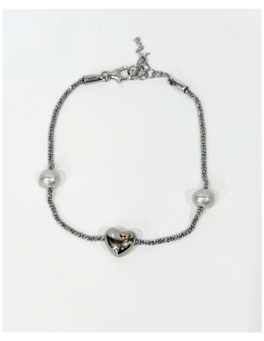 Delicato bracciale in argento 925 con perle coltivate e cuore in oro rosa 9 kt. Lunghezza regolabile 17–20 cm.