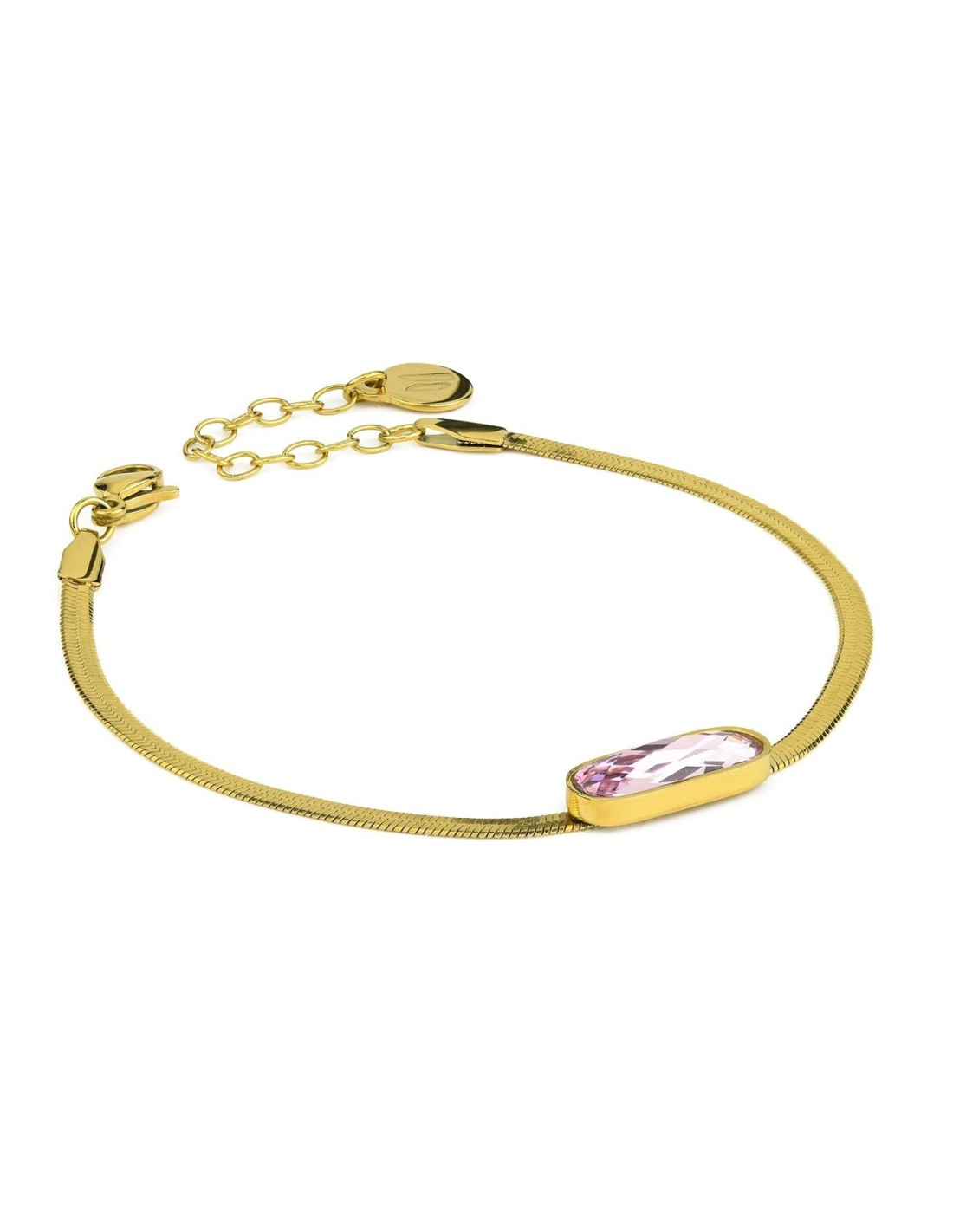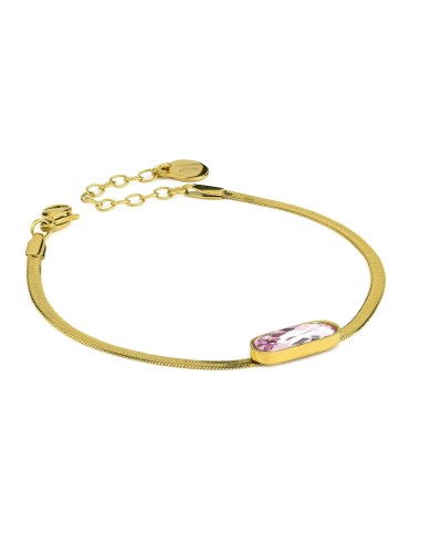 Il bracciale morbido placcato oro della collezione Jolie unisce raffinatezza e praticità, perfetto per chi ama un gioiello versatile da indossare ogni giorno. Realizzato in acciaio placcato oro giallo, il bracciale presenta una maglia piatta sottile e un cristallo centrale sfaccettato, disponibile in diverse tonalità: acquamarina, bianco, verde, blu, rosa e viola.