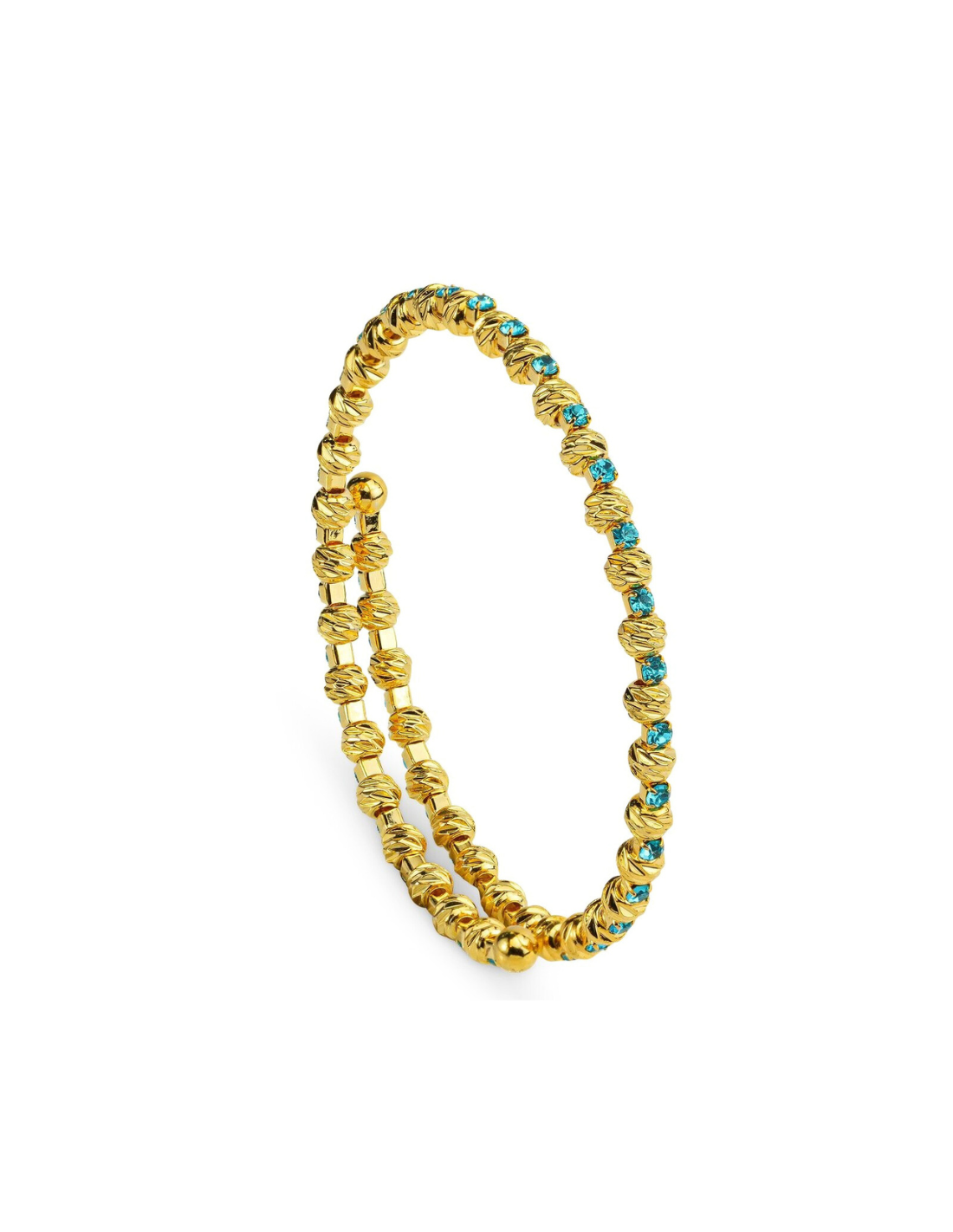 Bracciale a molla in bronzo placcato oro giallo impreziosito da boules lavorate e cristalli azzurri. Eleganza luminosa e stile raffinato per ogni occasione.