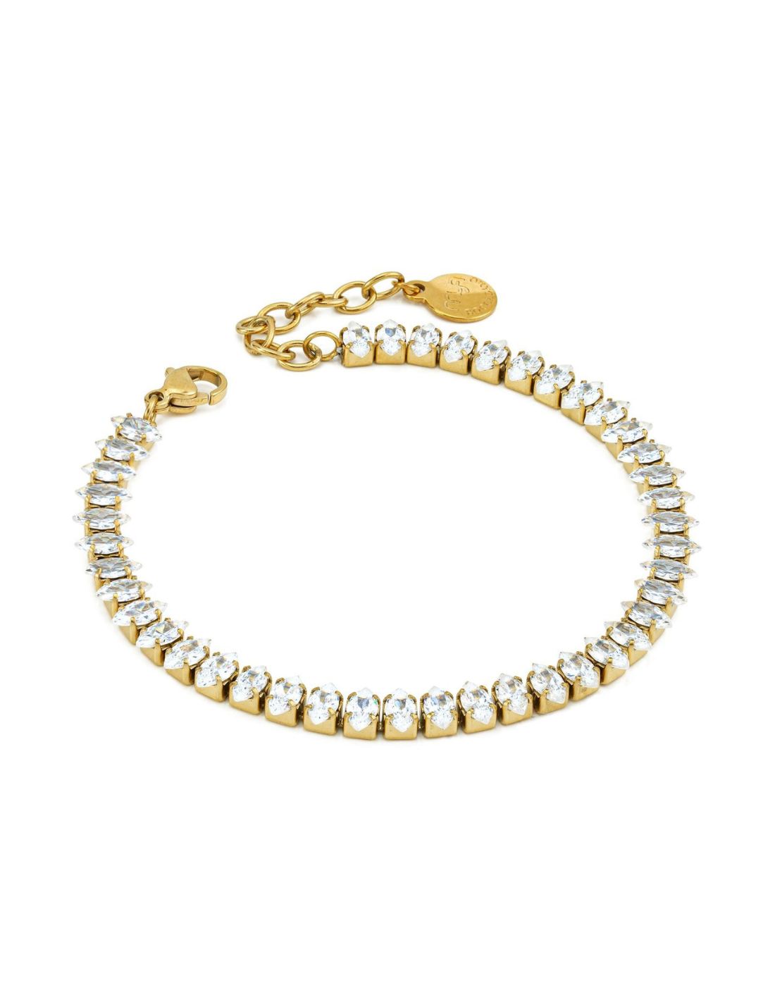 Bracciale tennis in acciaio con cristalli taglio navette, disponibile in versione placcata oro giallo o rodiata. Elegante, luminoso e perfetto per ogni occasione.
