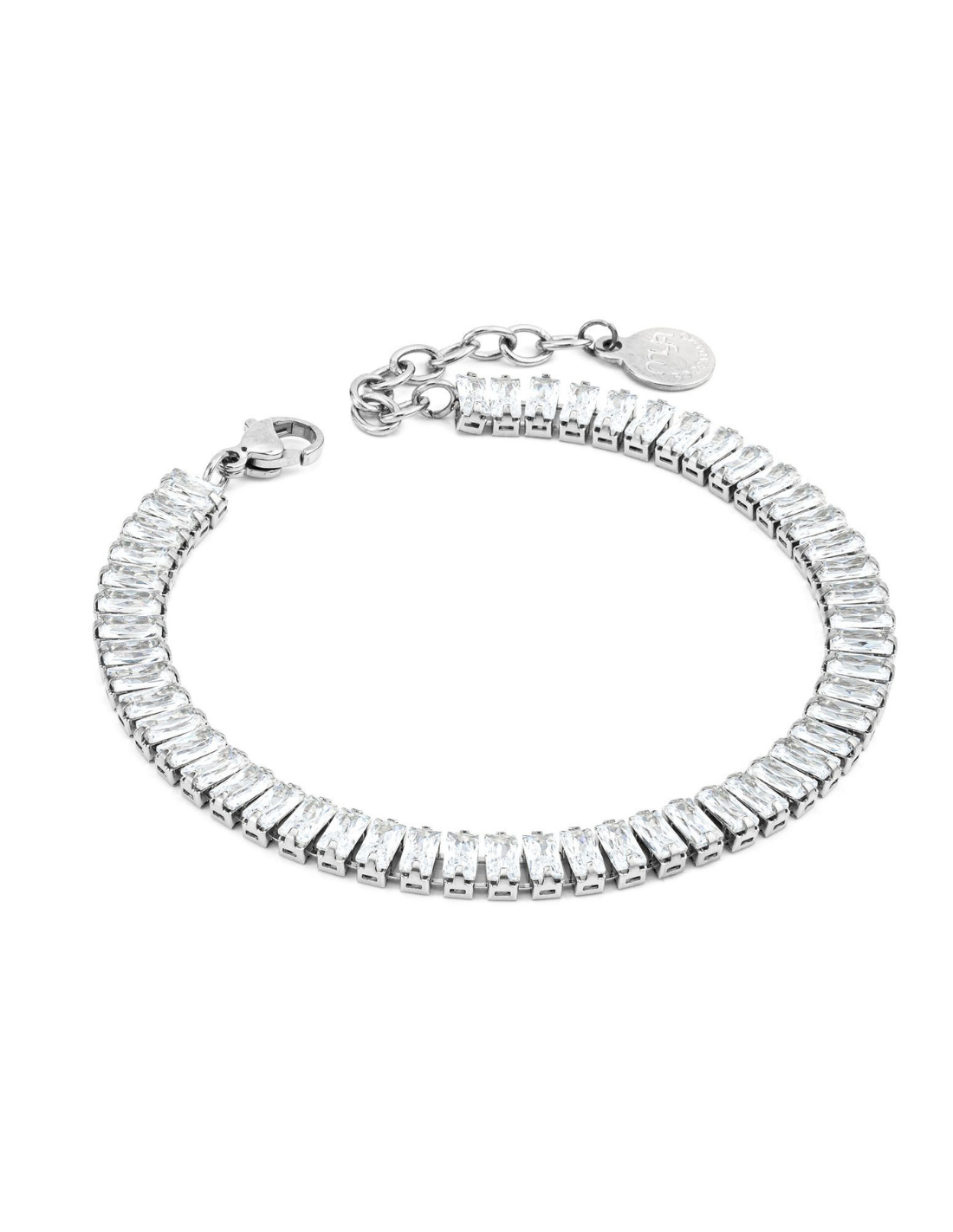 Bracciale tennis in acciaio con cristalli taglio baguette e linee essenziali. Un gioiello di pura luce, disponibile nella versione rodiata o placcata oro giallo.