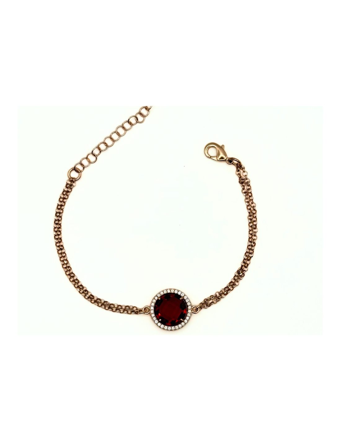 Bracciale doppio filo in bronzo placcato oro rosa con cristallo rosso tormalina e zirconi. Elegante, luminoso e regolabile fino a 20 cm.