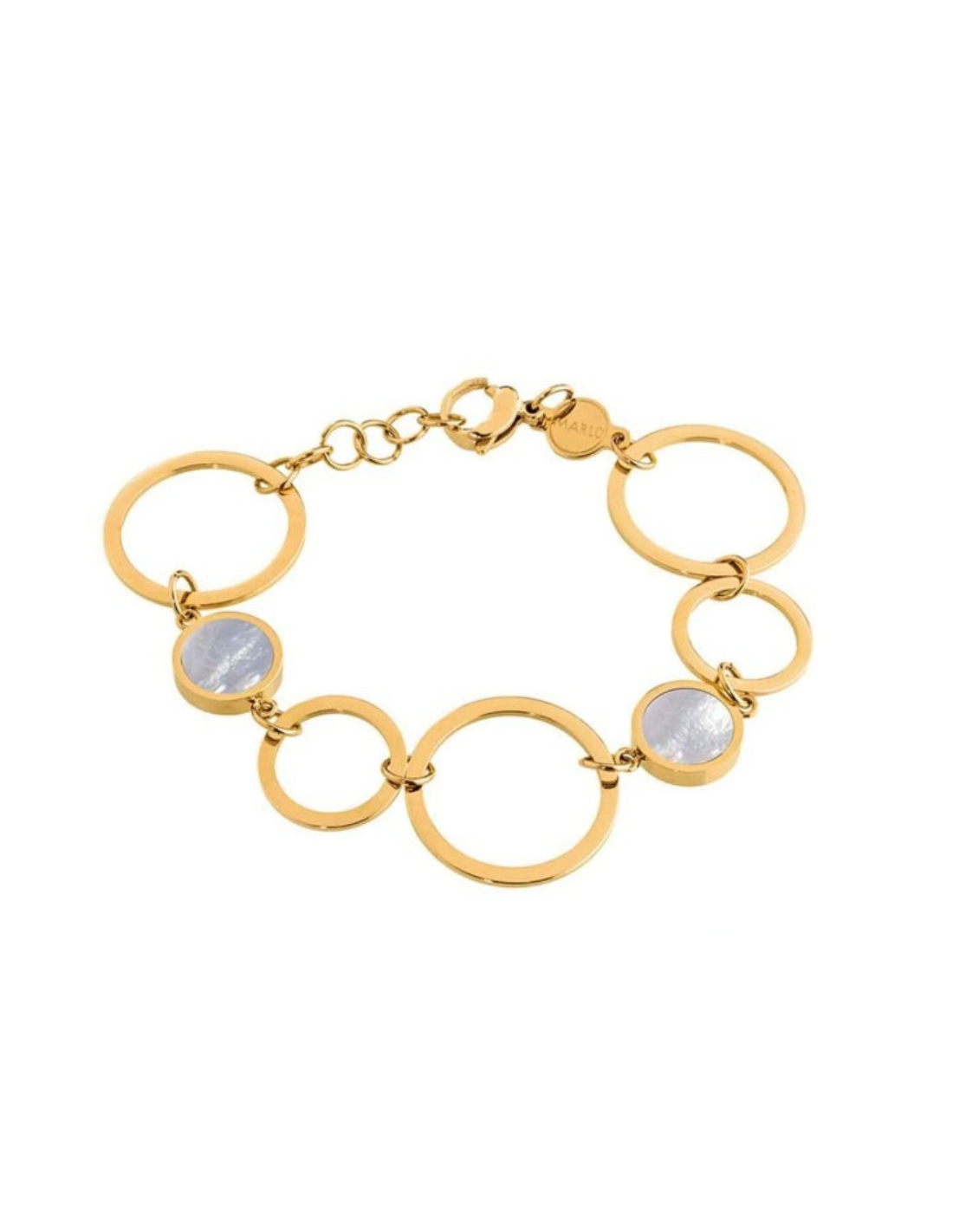 In questo bracciale Vision, il gioco dei cerchi in acciaio incontra la profondità misteriosa dell’acrilico nero e il bagliore delicato della madreperla, creando un equilibrio perfetto tra luminosità e carattere. Il movimento fluido degli elementi accompagna il polso con naturalezza, regalando una presenza elegante ma mai eccessiva, pensata per la donna che ama distinguersi con dettagli sobri e ricercati.