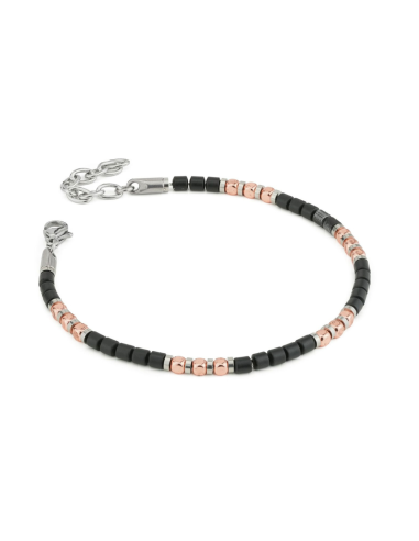 Bracciale da uomo in acciaio 316L con agata nera e cubotti di ematite rosa. Stile deciso, elegante e contemporaneo.