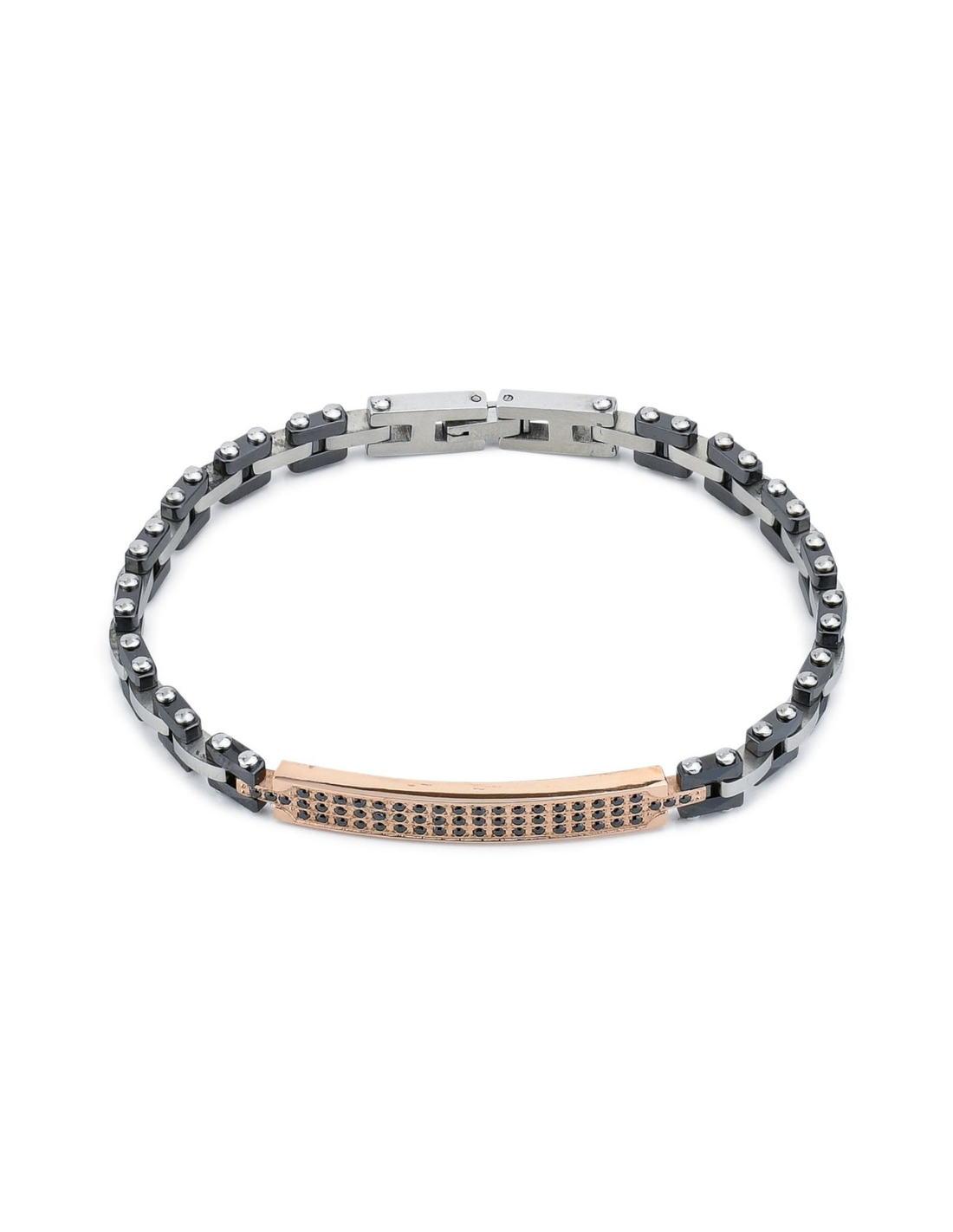 Bracciale modulare in acciaio 316L con maglie in PVD nero e centrale placcata oro rosa con tre file di zirconi neri incastonati. Eleganza decisa e contemporanea.