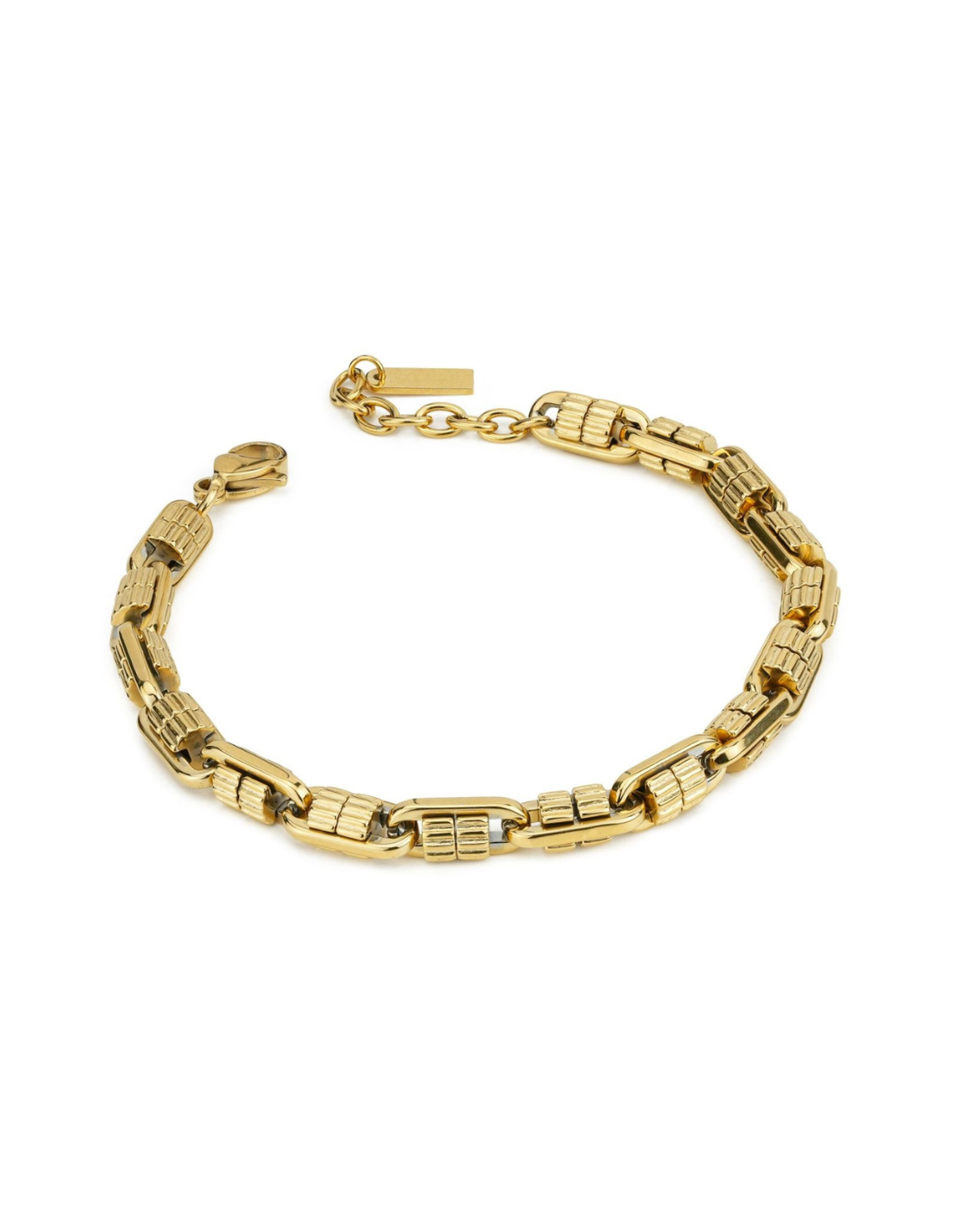Questo bracciale è realizzato in acciaio 316L anallergico, finemente placcato oro giallo, e caratterizzato dall’iconica maglia “a capsula”, un dettaglio distintivo che esalta il design deciso e maschile.