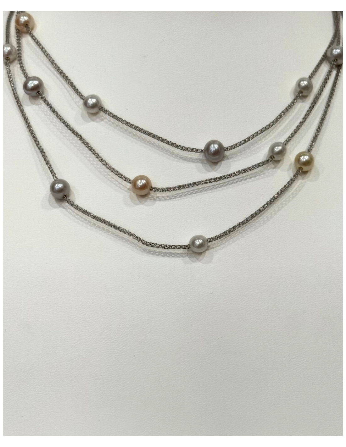 Lungo i tre fili si alternano perle vere Oriente di diverse dimensioni, scelte con cura per qualità e luminosità, capaci di riflettere la luce in modo naturale e creare un gioco armonioso di eleganza e dinamismo. Questa disposizione dona al gioiello un carattere particolare: non si tratta di una semplice collana di perle, ma di un accessorio che valorizza con classe sia un abito da sera che un look più sobrio.