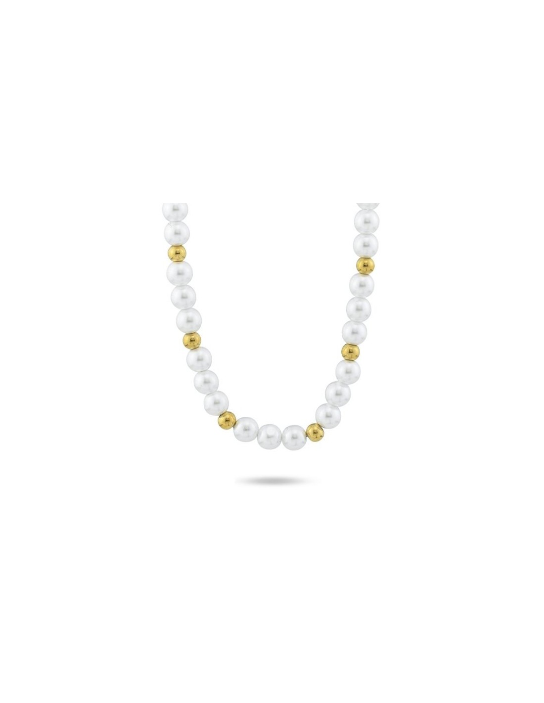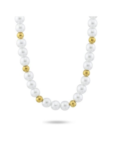 Collana con perle sintetiche e boules medie placcate oro giallo. Un design contemporaneo che unisce la luminosità delle perle alla brillantezza metallica dell’acciaio per un effetto elegante e sofisticato.
