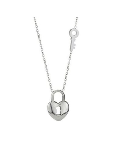 Collana in acciaio rodiato 316L con centrale a forma di lucchetto e chiave del cuore, simbolo di un amore che si custodisce per sempre. Elegante, resistente e anallergica.