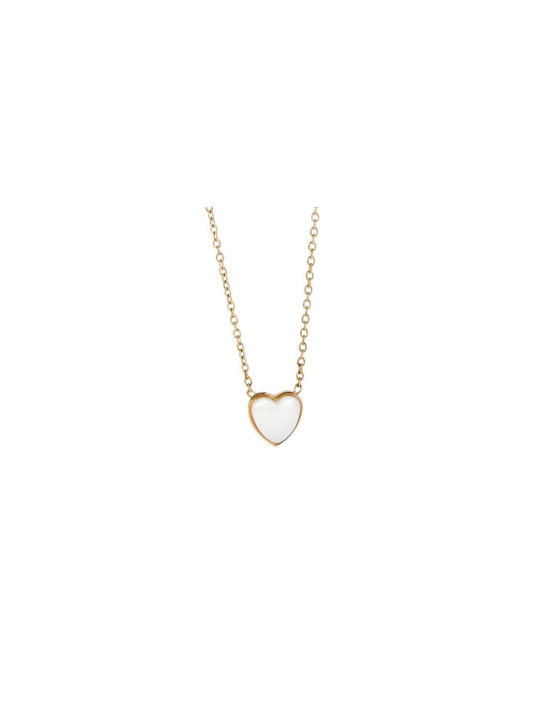Collana in acciaio rodiato, placcata in oro giallo o oro rosa, con cuore in ceramica bianca. Un gioiello raffinato e contemporaneo, simbolo di eleganza e dolcezza.