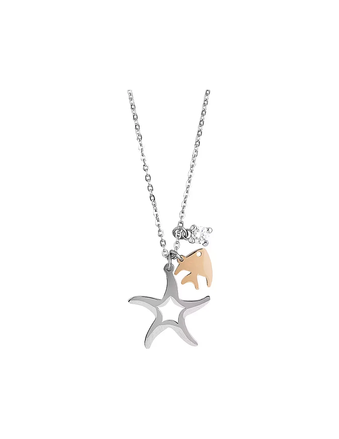 Collana Boccadamo in acciaio anallergico con charm marini: stella marina, pesciolino placcato oro rosa e zircone bianco. Eleganza e freschezza in un solo gioiello.