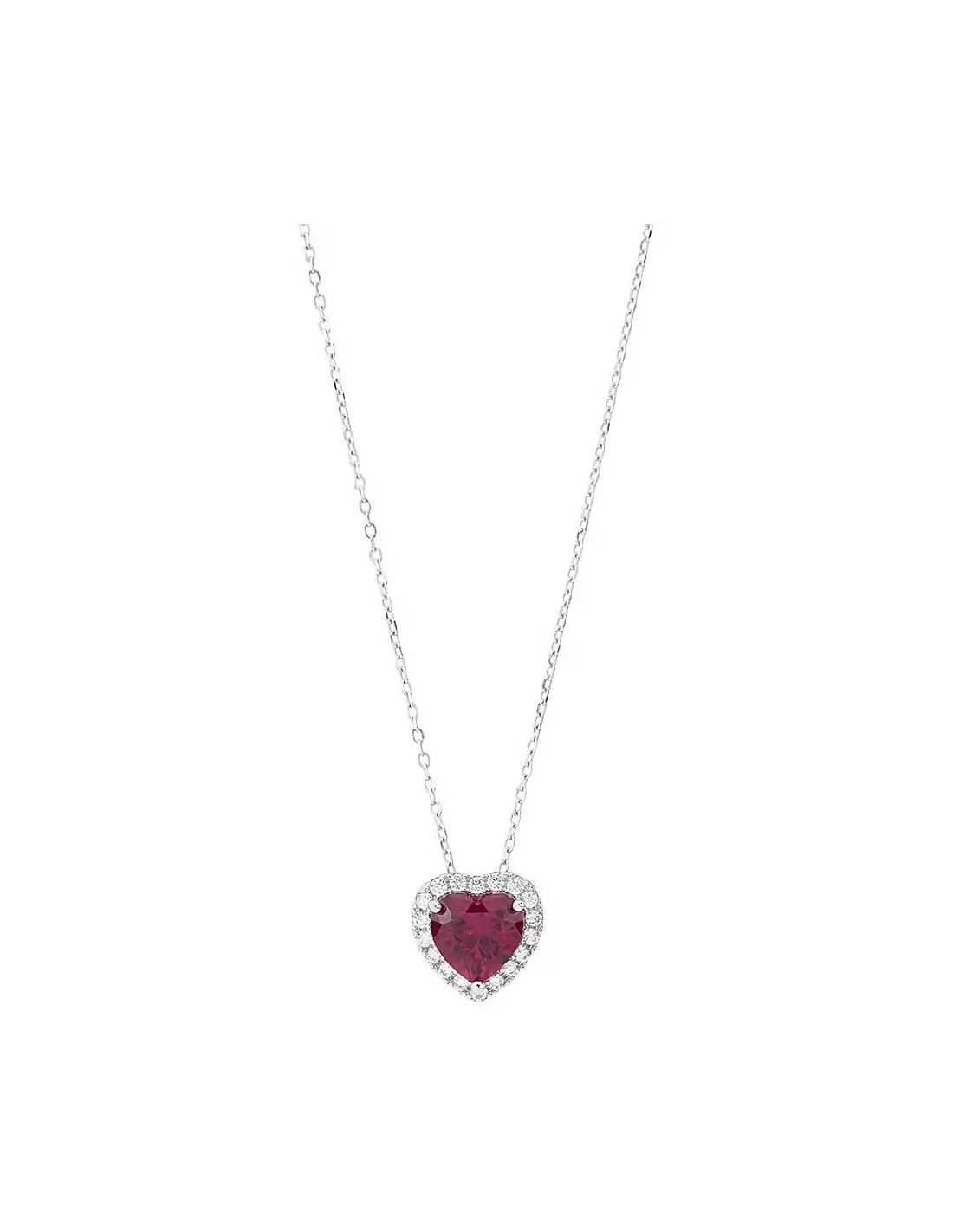 Il suo pendente a forma di cuore, con cristallo rosso intenso, è impreziosito da una cornice di zirconi bianchi luminosi, disposti in modo da esaltare il colore e la profondità della pietra centrale.