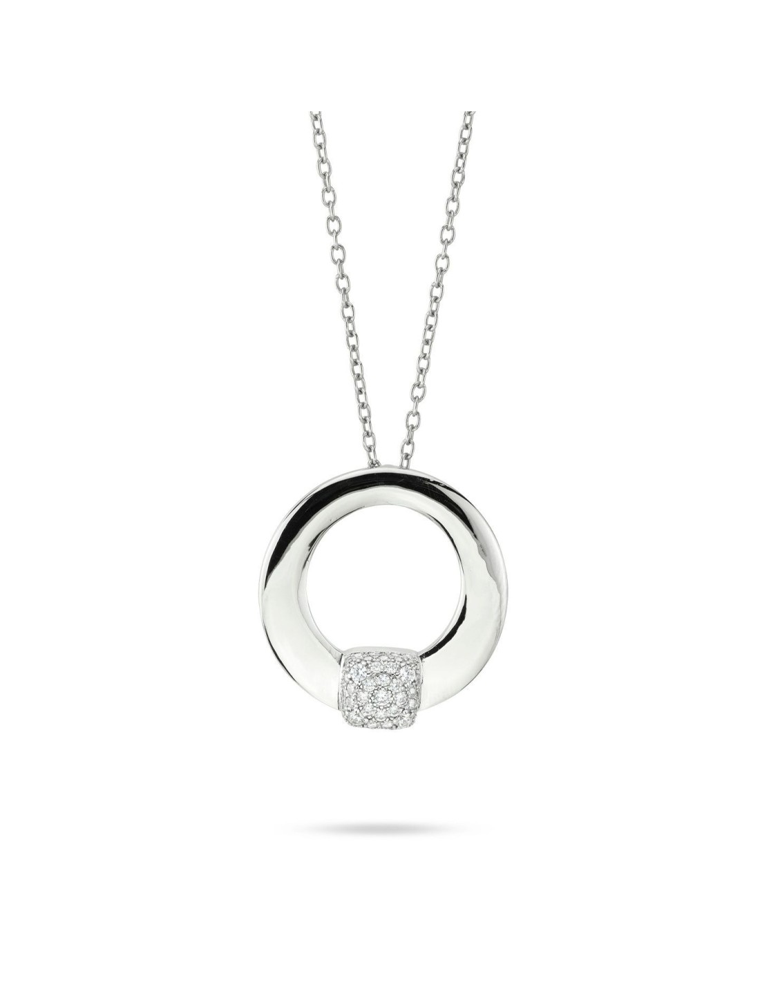 BoccadamoGirocollo rodiato con pendente circolare piccolo e quadrato centrale in pavé di zirconi. Luminoso, raffinato e perfetto per ogni occasione.