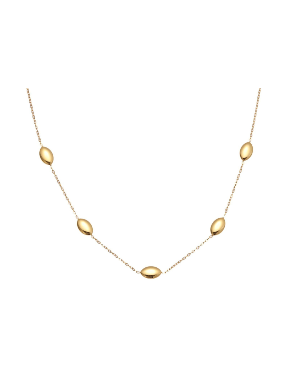 Cinque chicchi di riso si allineano al centro come un filo di perle contemporaneo, levigati e lucidi, morbidi e brillanti. Nella versione placcata oro giallo emanano un bagliore caldo e radioso, mentre nella variante rodiata si trasformano in punti luce chiari e moderni, discreti e sofisticati.