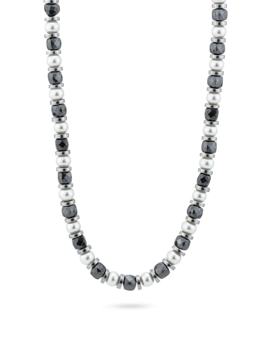 Collana in acciaio 316L rodiato con cubotti di onice e perle sintetiche, per uno stile moderno e deciso. Lunghezza regolabile fino a 50 cm.