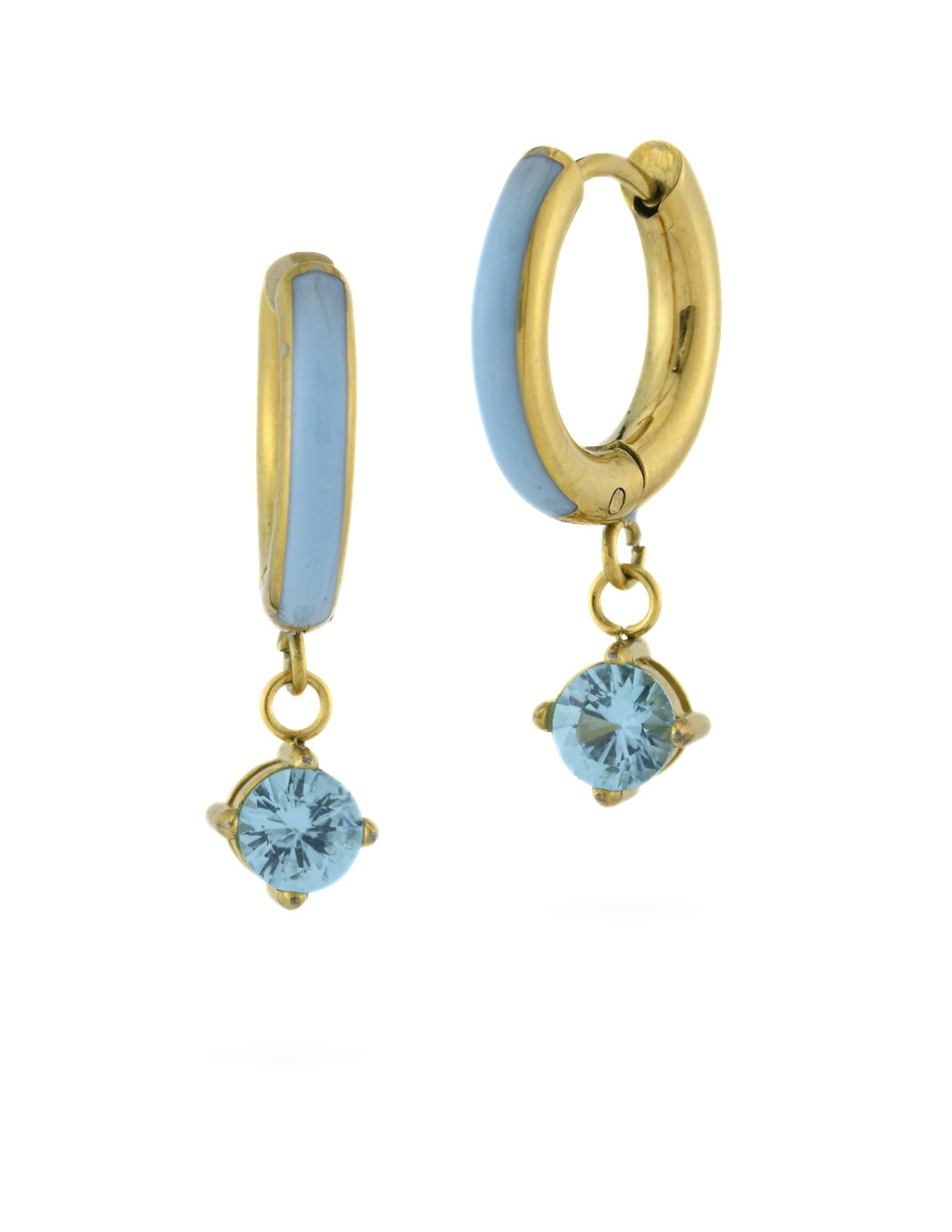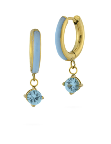 Orecchini a cerchio in acciaio placcato oro giallo con zircone e smalto color acquamarina. Luminosi, moderni e raffinati.