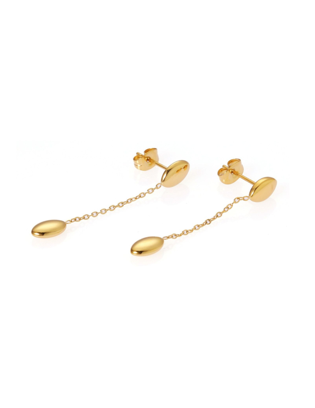 Orecchini pendenti in acciaio con due chicchi di riso lucidi in sequenza, disponibili in versione gold e rodiata. Un gioiello leggero e moderno, pensato per illuminare con naturalezza ogni movimento.
