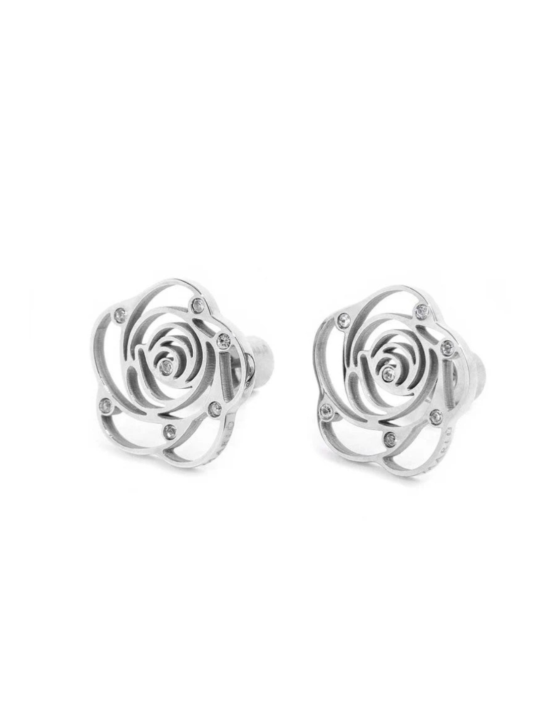 Questi orecchini Marlù reinterpretano il simbolo della rosa in una versione moderna e raffinata. La struttura traforata disegna con leggerezza i petali, mentre i cristalli bianchi incastonati ne illuminano i contorni, creando una brillantezza elegante ma mai eccessiva. Il logo laserato sul bordo aggiunge una nota distintiva, discreta e preziosa, che richiama la cura dei dettagli tipica del brand.