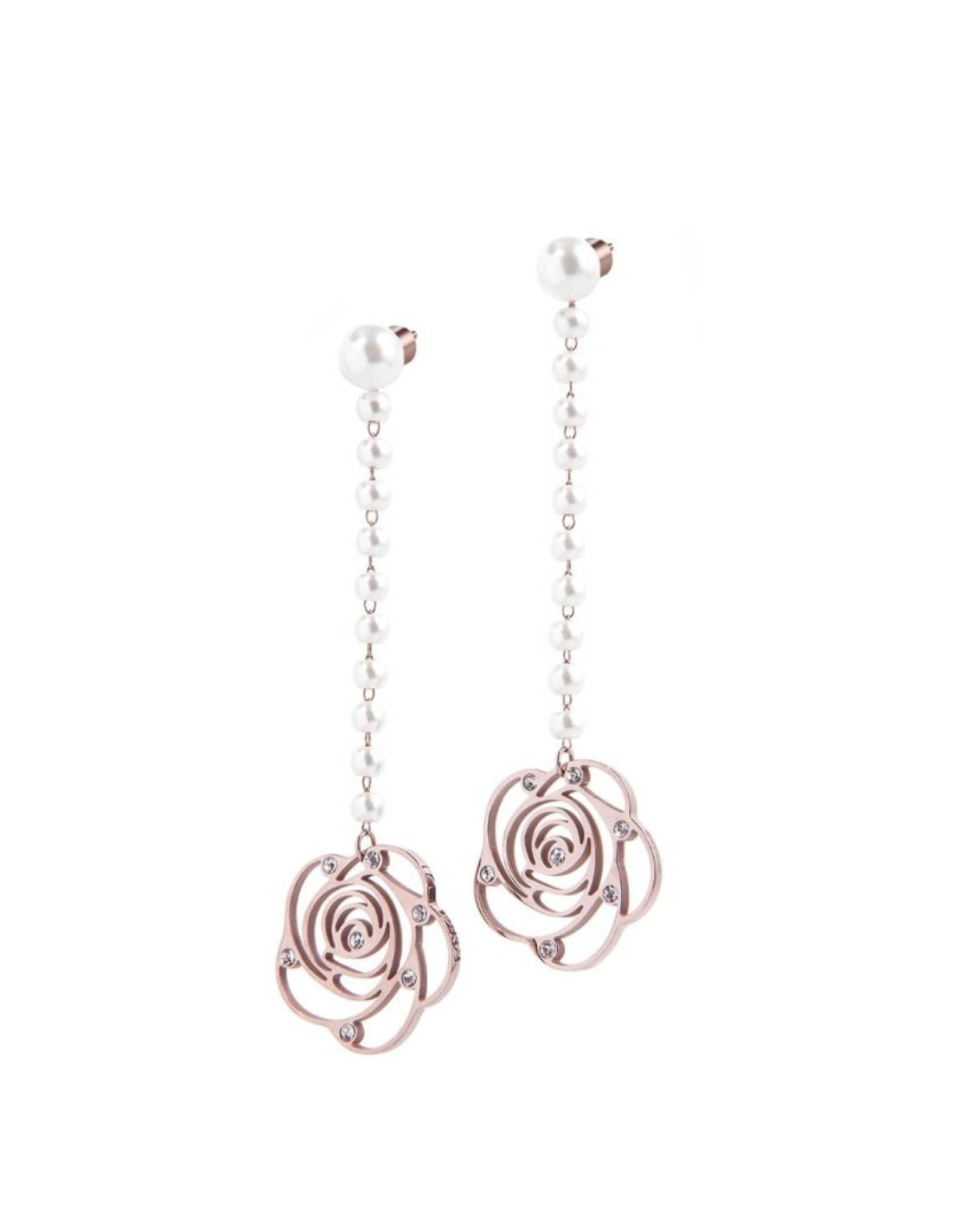 Raffinati orecchini pendenti in acciaio/ acciaio PVD rosé con perle rivestite e charm a rosa traforata impreziosito da cristalli bianchi. Il pendente è removibile, per due look in uno.