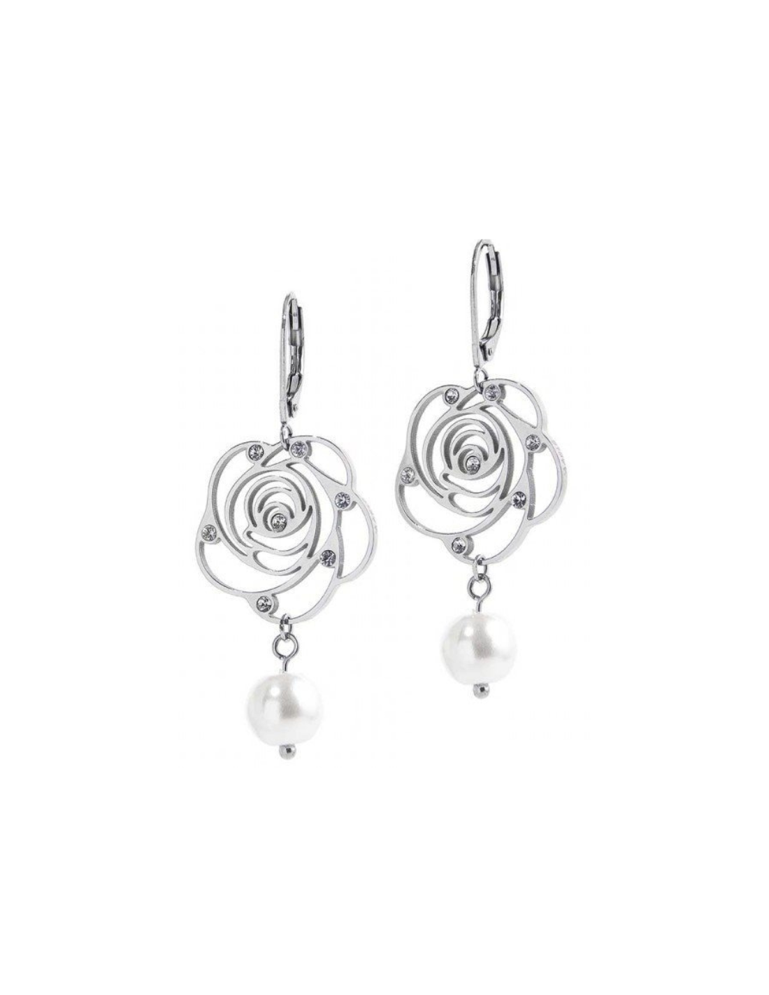 Coppia di orecchini pendenti con monachella, disponibili in acciaio, con rosa traforata impreziosita da cristalli bianchi e perla bianca rivestita. Lunghezza totale 4,8 cm.