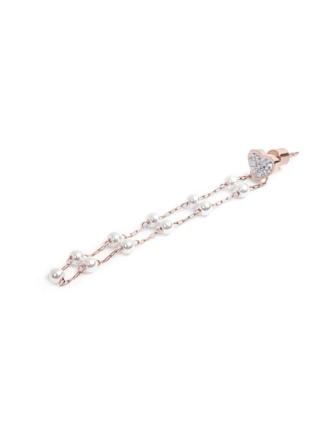 Mono orecchino pendente con cuore decorato da cristalli bianchi e catena con perle bianche rivestite, disponibile in acciaio, acciaio PVD oro rosa o PVD oro giallo. Lunghezza totale 6,5 cm.