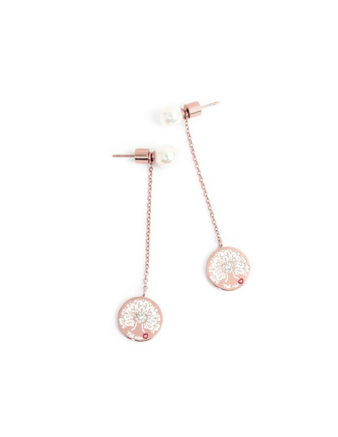 Coppia di orecchini pendenti in acciaio, con albero dei valori smaltato bianco e piccolo cuore con cristalli. Un simbolo luminoso da indossare ogni giorno.