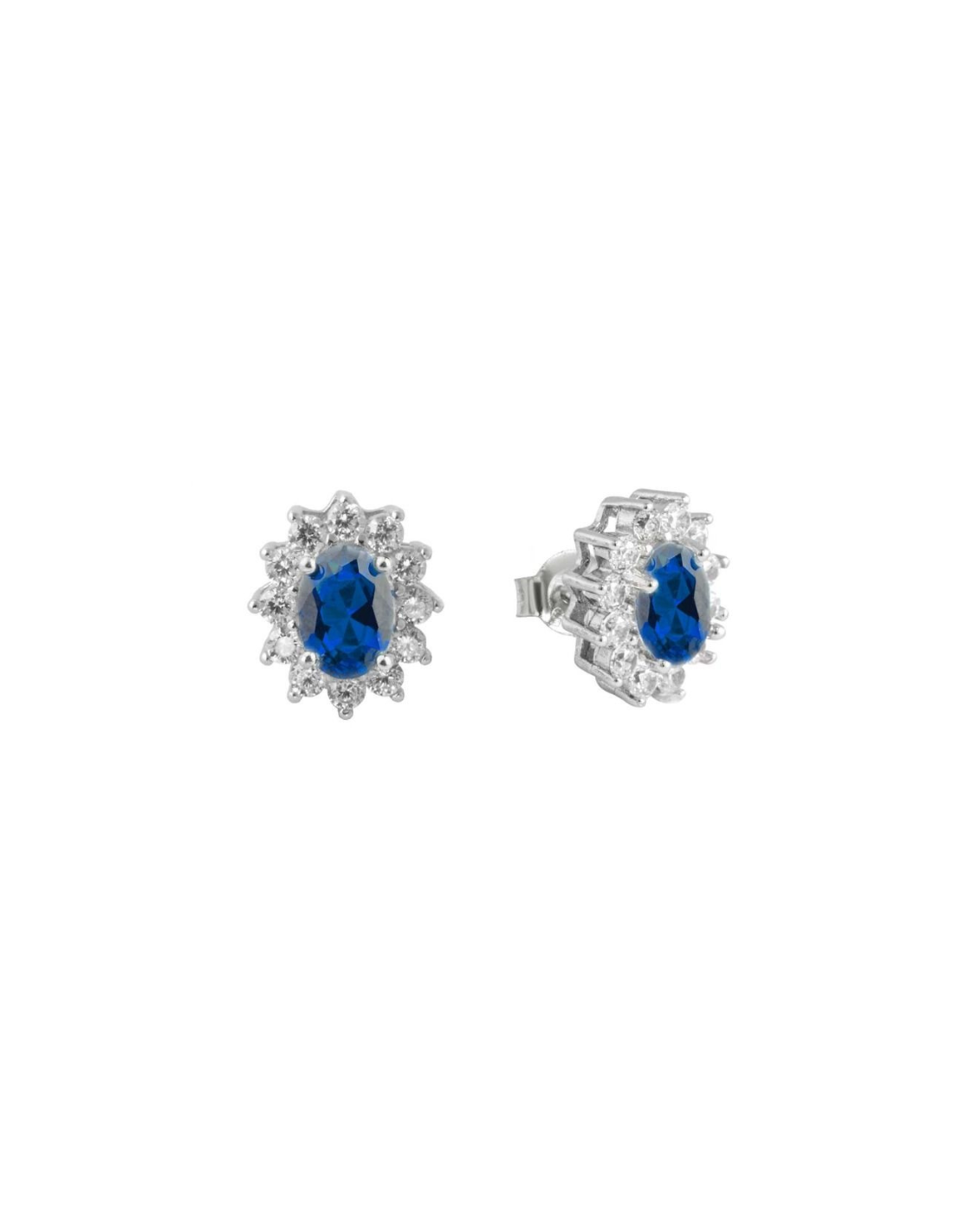 Orecchini in argento 925 con zircone blu centrale e luminoso contorno di zirconi bianchi, chiusura a farfallina. Una creazione raffinata della collezione Tutti pazzi per il colore, perfetta per un dono speciale.