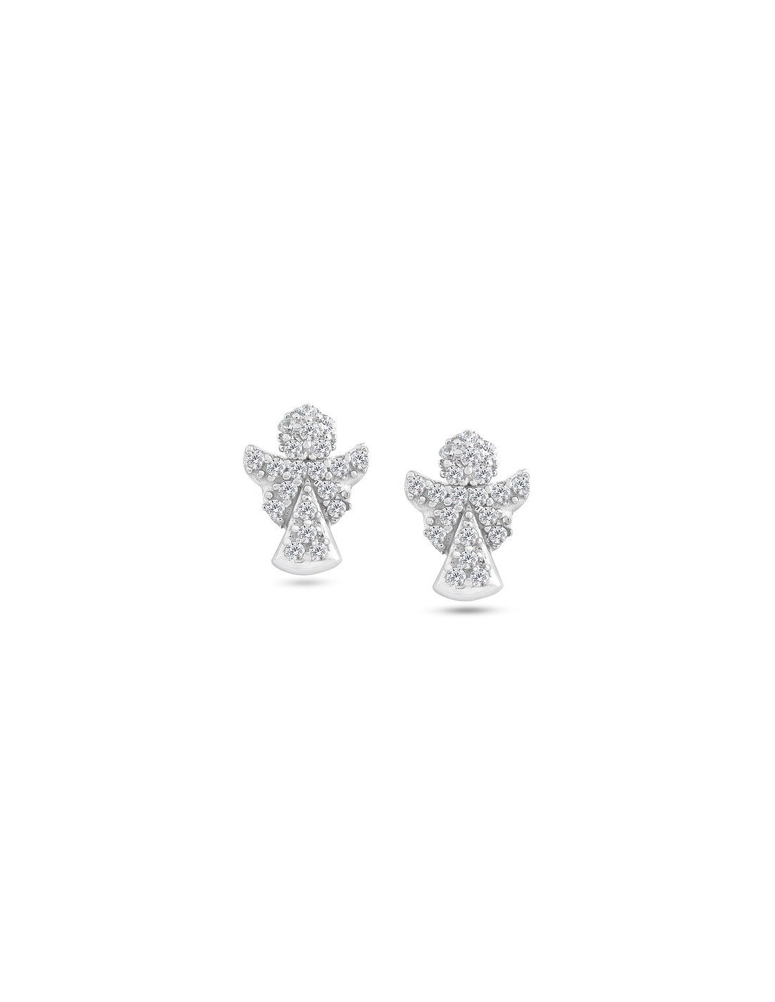 Orecchini in oro bianco 750‰ con angioletti impreziositi da pavè di zirconi bianchi, simbolo di protezione, purezza e amore. Un gioiello dal significato profondo, ideale come regalo per cerimonie religiose.